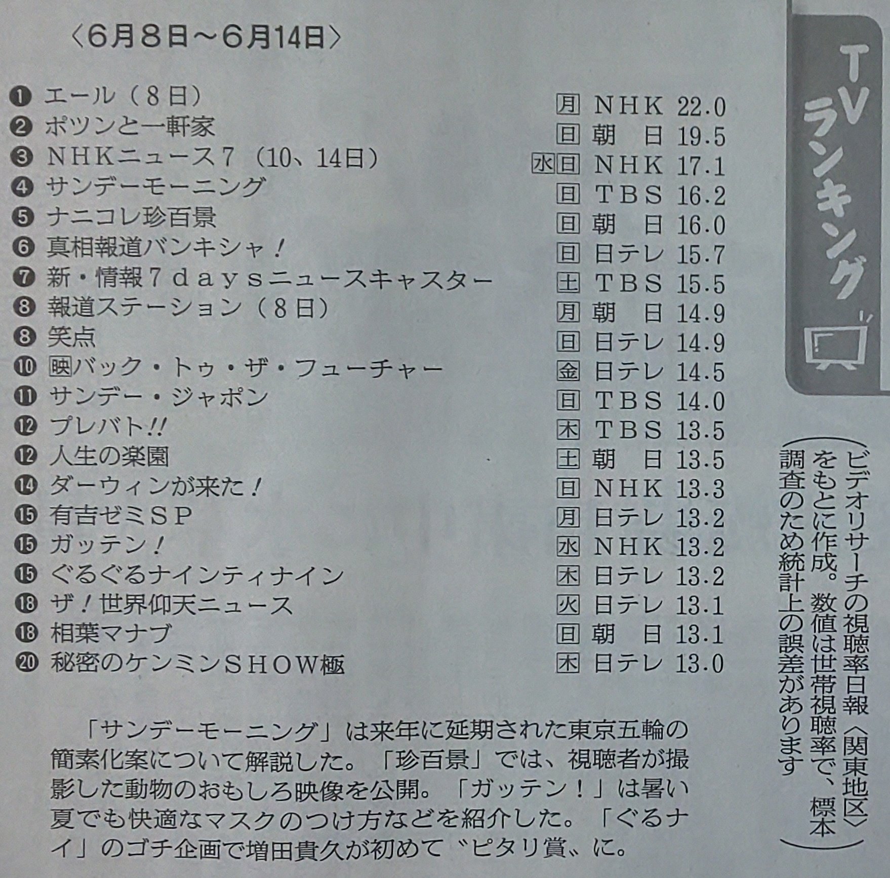 792 tbs サンデーモーニング のコア視聴率は なかった 橋下徹 9 を拡張しすぎ と読売世論74 みやわきチャンネル 仮 932restart792 政治 0 06 いままで路線で良いのか と質問するが 3 08 サンデーモーニングのコア視聴率はどう 5 37 年. サンデーモーニング の視聴率は サンモ二アンチの人 たちと 張さんのスポーツコーナーで持っているという話ですもんねww 番組放送中のtwitterから サンデーモーニング のコメンテーターたちに 反論する人 サンモ二アンチ たちの正論. サンデーモーニングから張本さんが居なくなったら番組自体の視聴率に影響あると思いますか 無いと思う 落合さんあたりに変わってもらえると 視聴率は上がると思う 解決済み 質問日時 2019 8 28 0 23 回答数 1 閲覧数 1.